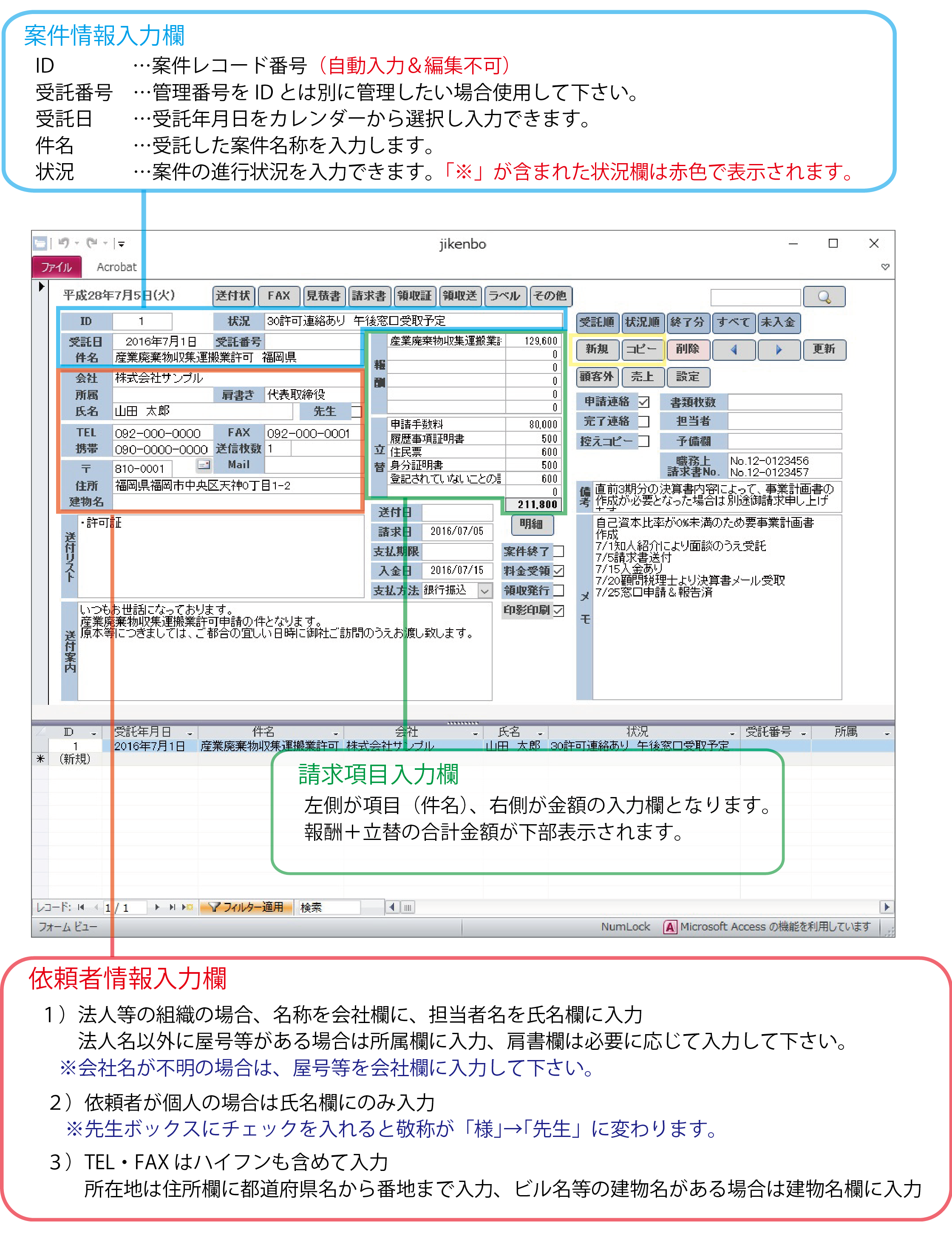 事件簿を起動すると案件情報を入力する画面が表示されます。ここに入力されたデータが送付状等に反映されます。