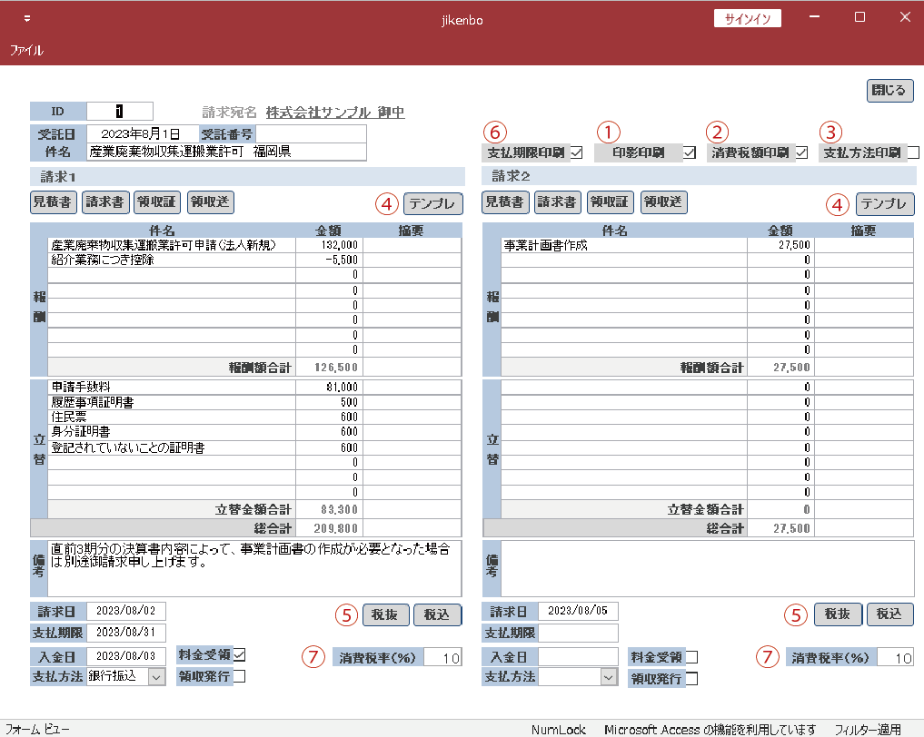 通常は「請求1」のみご利用いただき、着手金+成功報酬など、請求を2回に分ける場合に「請求2」をご利用下さい。