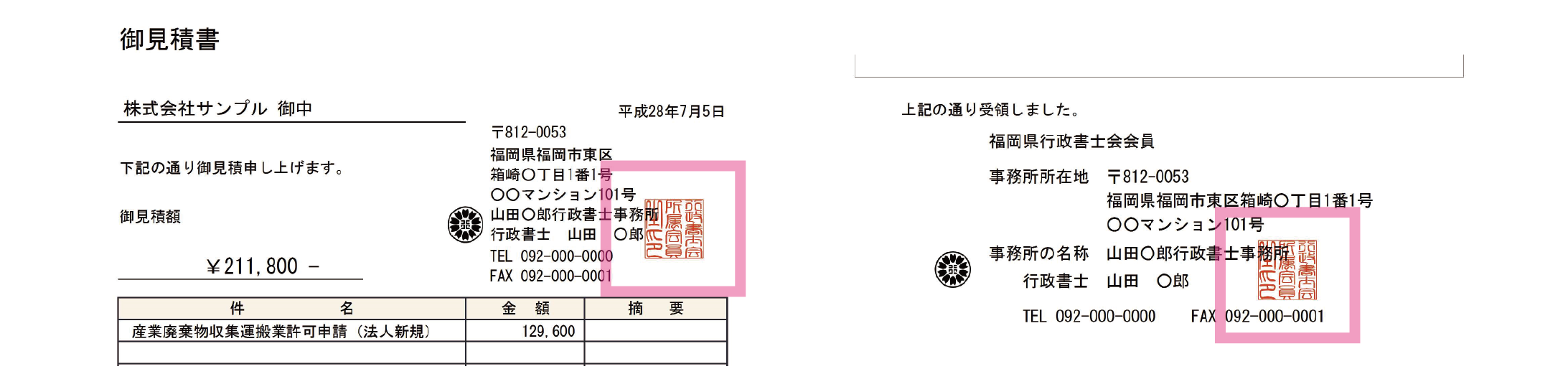 チェックが入った状態で見積書、見積兼請求書、請求書、領収証を出力すると「ロゴ・印影表示設定」にて設定した印影が事務所名横に表示されます。