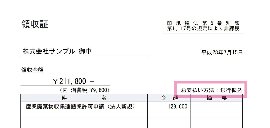 チェックが入った状態で領収証を出力すると入力フォームの「支払方法」欄にて選択した支払方法が表示されます。