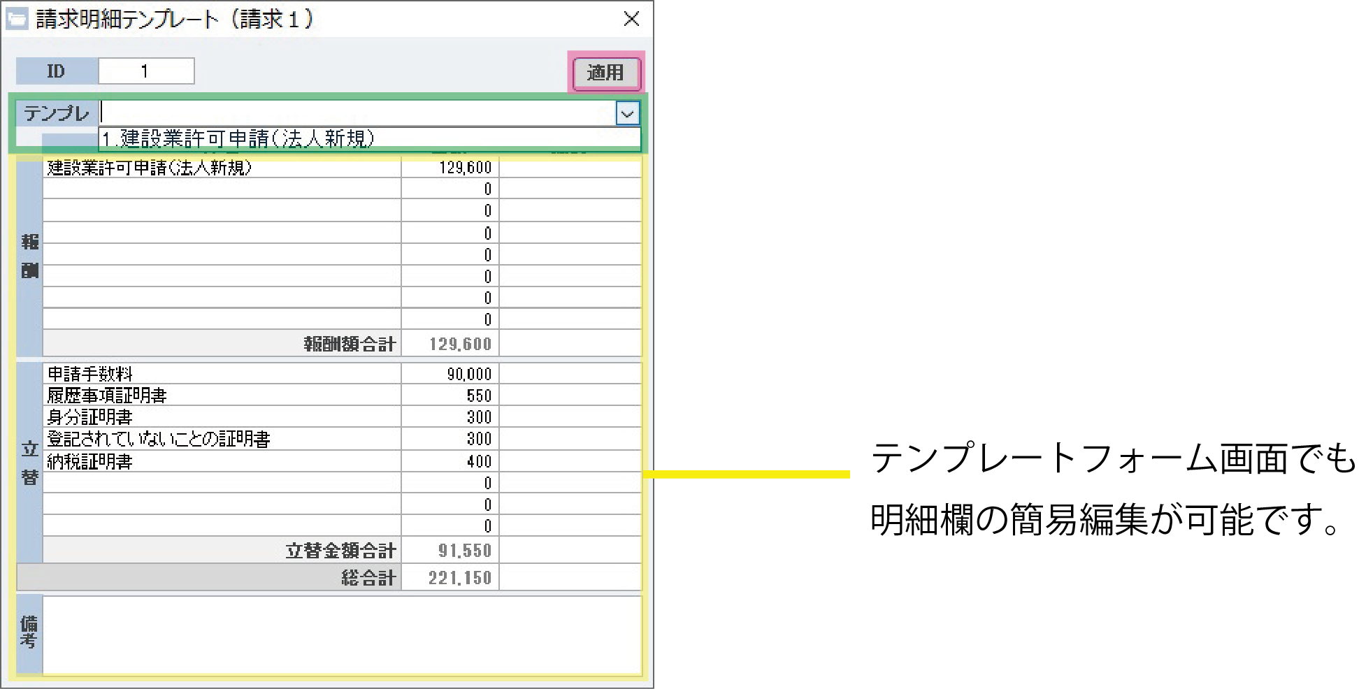 予め「設定:請求明細」にて設定したテンプレートデータをコンボボックスから選択し、適用ボタンを押すと、請求明細欄にテンプレートのデータが反映されます。