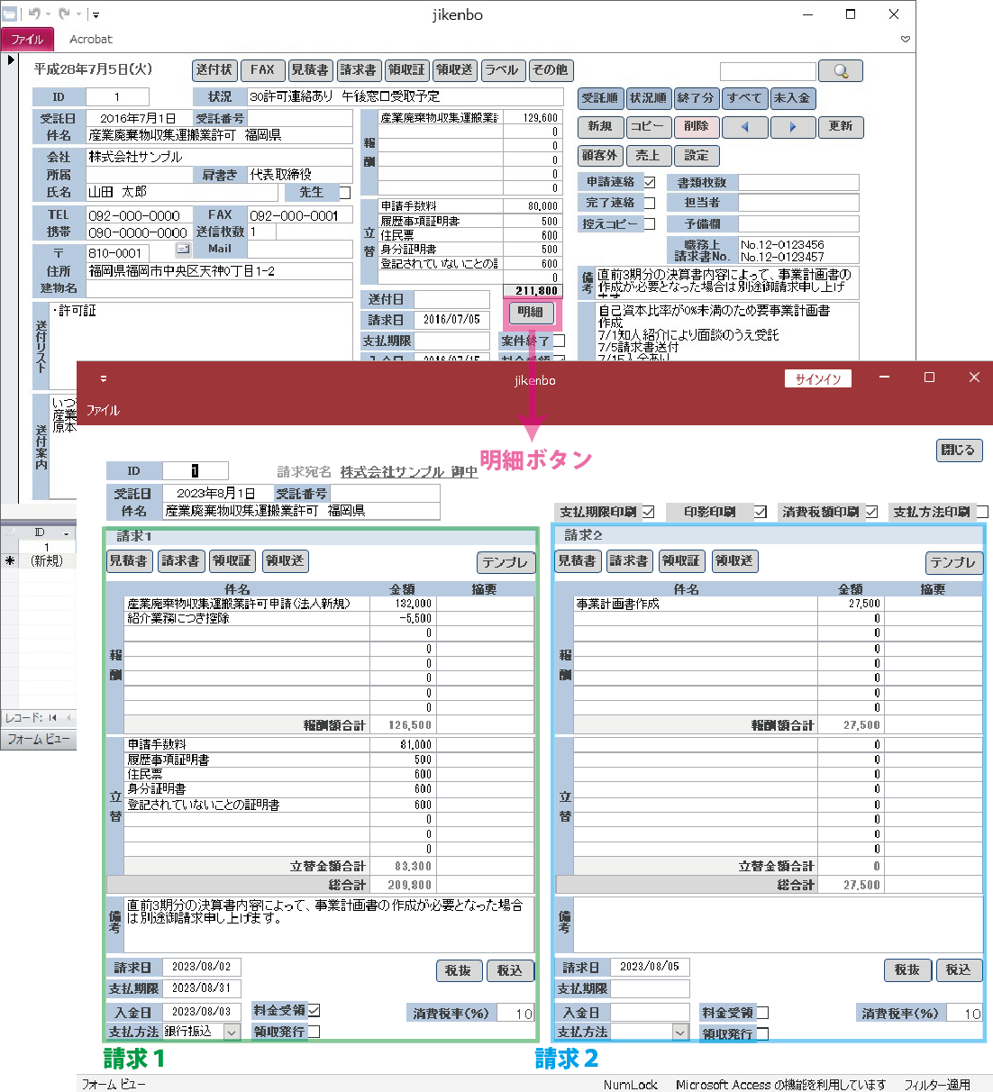 「明細」ボタンを押すと請求明細の入力フォームに画面が変わります。