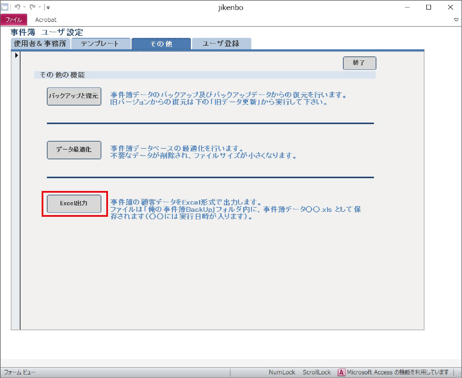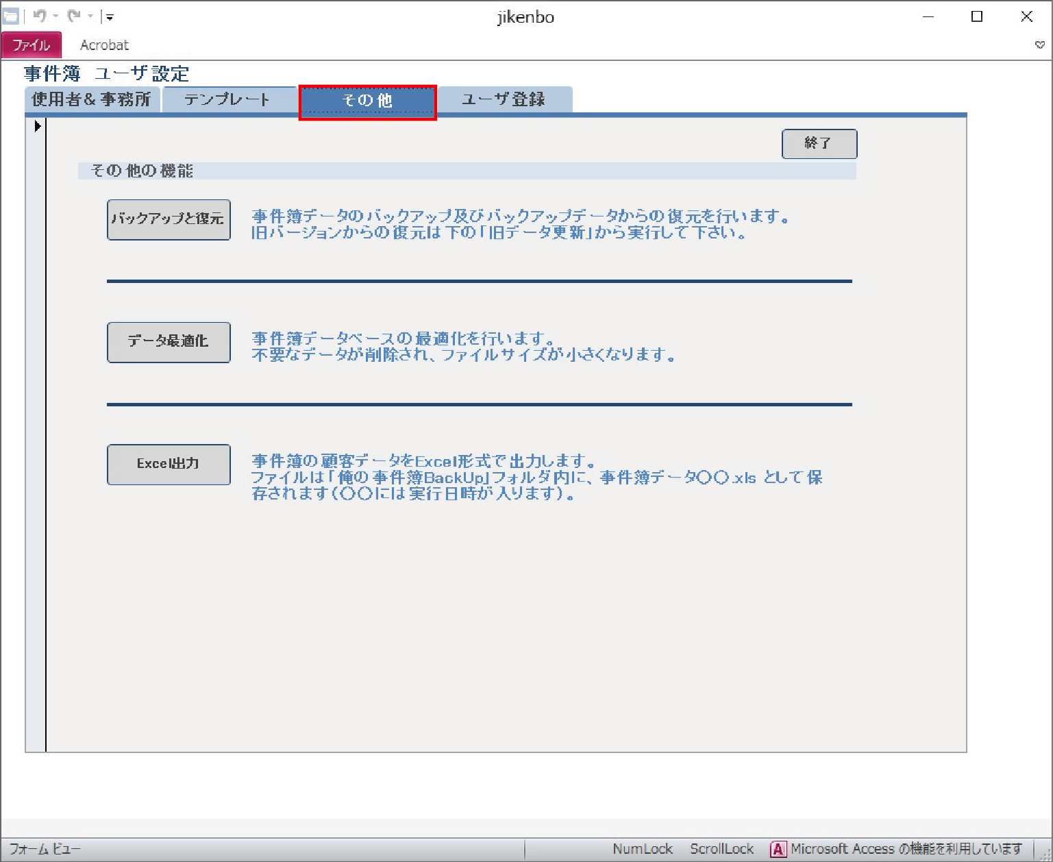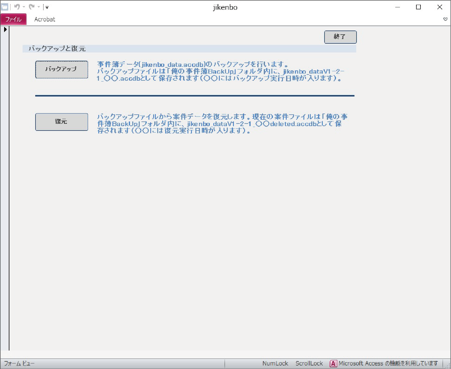 事件簿案件データファイルである「jikenbo_data.accdb」についてのバックアップ及び復元が可能です。