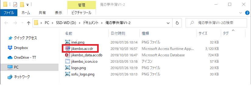 - 「jikenbo.accdr」のファイル名を「jikenbo.accdb」に変更します。