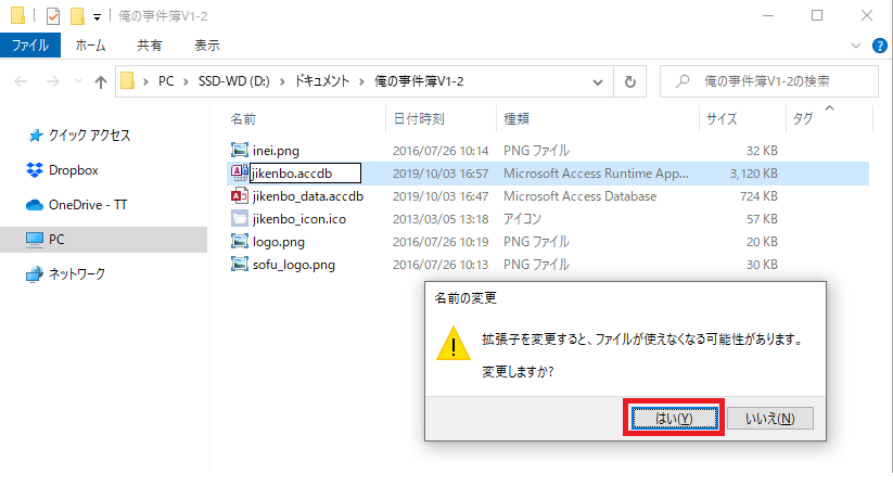 ファイルを選択した状態でファイル名をクリックもしくはF2キーを押すとファイル名編集状態となりファイル名及び拡張子が変更できます。一番最後の「r」を「b」に変更して下さい(半角)。 - 拡張子を変更したファイルをダブルクリックして製品版Accessにて事件簿ソフトが正常に起動・動作することをご確認下さい。
