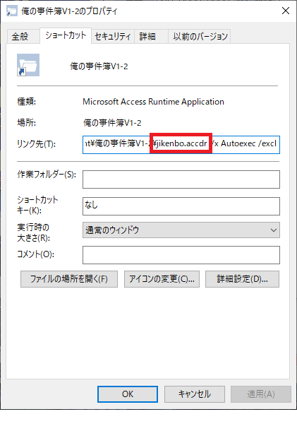 ショートカットキーを右クリック→プロパティをクリック後、ショートカットタブ内にある「リンク先」の中にある「jikenbo.accdr」の最後の一文字「r」を先ほどと同様に「b」に変更します。 - ショートカットでの事件簿起動が確認できましたら、エクスプローラーの「ファイル名拡張子」のチェックを外し、拡張子が見えない元の状態に戻しておきます。以上で作業は完了です。