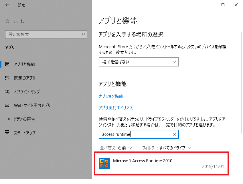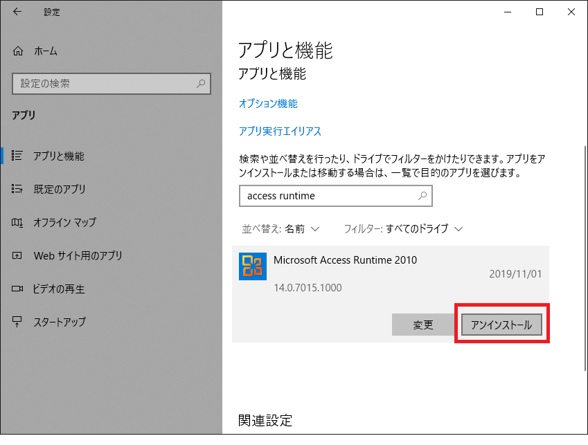 - アプリと機能の一覧から「Microsoft Access Runtime 2010(2013)」をクリック