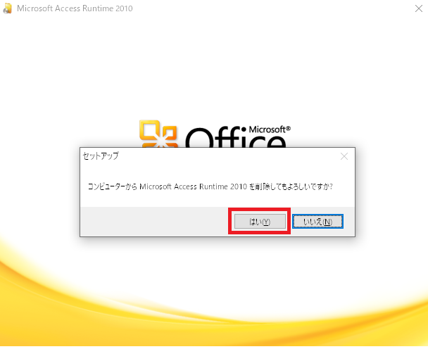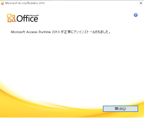 Office2016以降の製品版Accessがインストールされていない場合、Access2010Runtimeをアンインストール後、インストール済Officeに応じたバージョンのAccessRuntimeについてインストールが必要です。