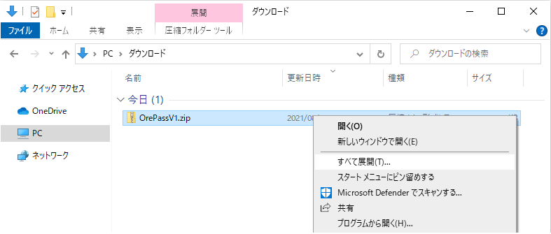 ダウンロードが完了すると「OrePassV○○○.zip」というファイルが表示されます(PCの環境によって「.zip」は表示されません。○○○はバージョン情報)。