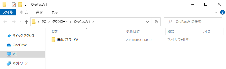 展開が完了すると「俺のパスワードV○○」フォルダが表示されフォルダ内に以下のファイルが作成されます。