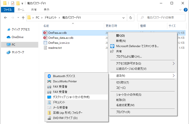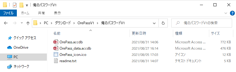 Accessインストール済の環境の場合「OrePass.accdb」をダブルクリックするとソフトが起動します。