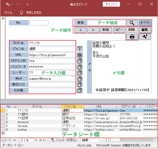 使用例:各データのジャンル欄に「銀行」や「通販」等の単語入力しておくとそのワードで一覧抽出